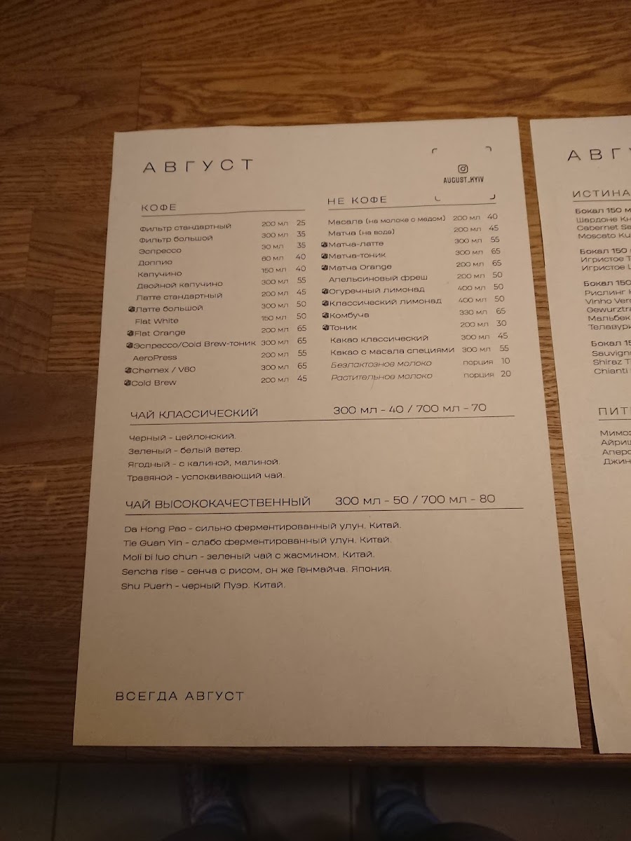 The café specializes in an array of expertly crafted coffees, made from premium beans sourced from High Five. If you're a connoisseur, treat yourself to their standard filter coffee (UAH 40), which promises a rich and aromatic experience. For those who enjoy a creamier texture, the Flat White (UAH 55) is an absolute must-try—its velvety smoothness paired with a carefully calibrated balance of espresso and steamed milk is simply divine. Don't overlook the unique Flat Orange (UAH 70), a refreshing twist that merges robust coffee with the zest of fresh oranges.